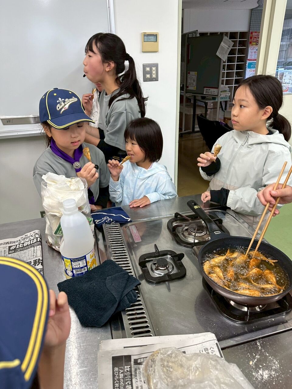 はじめは悲鳴をあげながら頭やお腹を切り落とし、ゼイゴも削ぎ落とし、唐揚げ粉をつけて揚げ始めると…だんだん美味しそうな匂いに変わってきました。