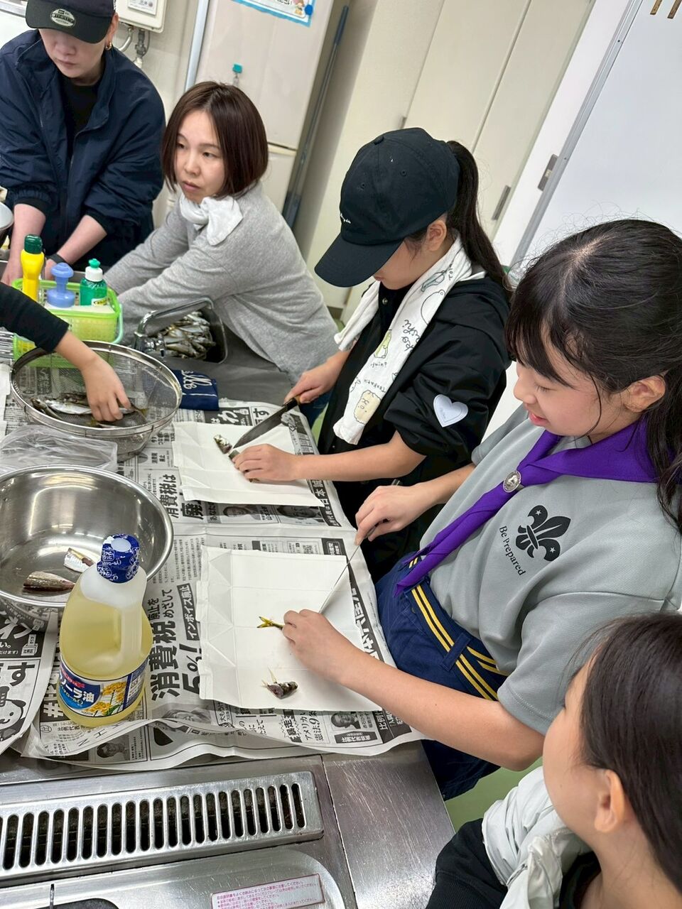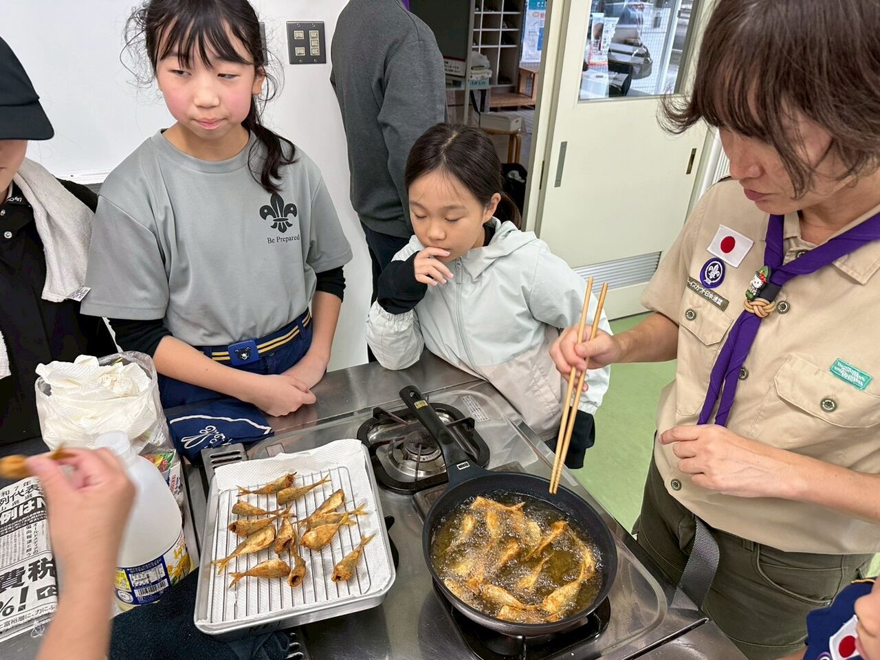 いつもは現地で釣った魚を唐揚げにして食べるのですが、今年は強風と雨の心配もあり、活動拠点の公民館に移動しました。