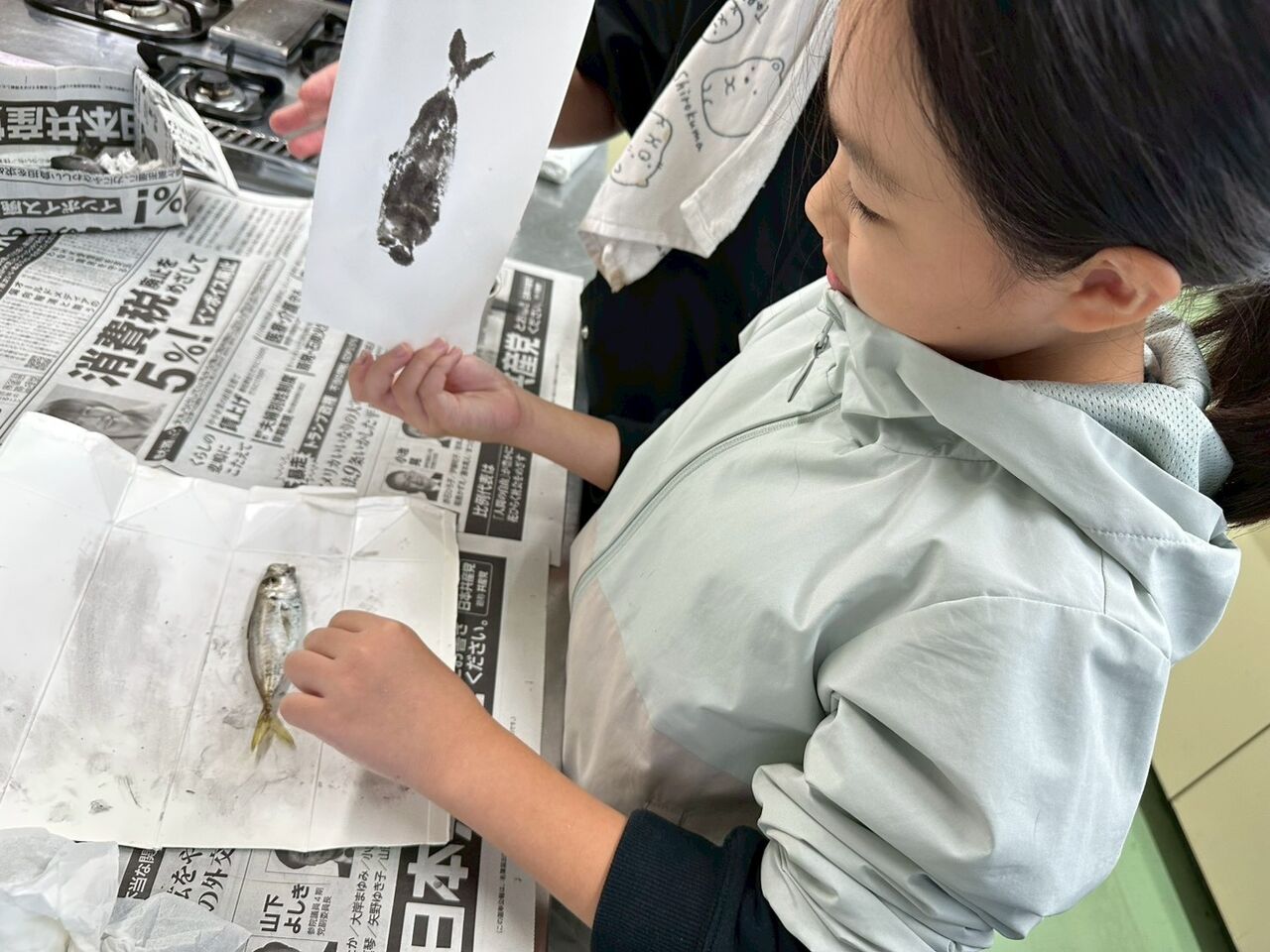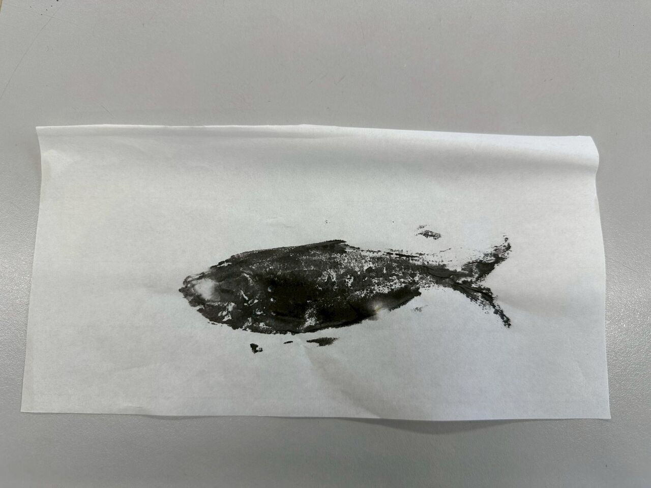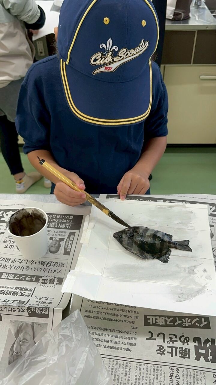 事前に調べた手順で、いざ挑戦。ちょっと墨が濃かったかもしれないけど、みんな上手に魚拓が取れました。