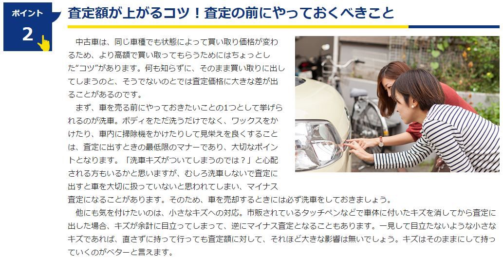 査定前に愛車を綺麗にすることです。綺麗にする効果については諸説ありますが、多くの買取専門店のホームページを見ると、査定額UPのポイントとして綺麗にすると明確に記載があります。