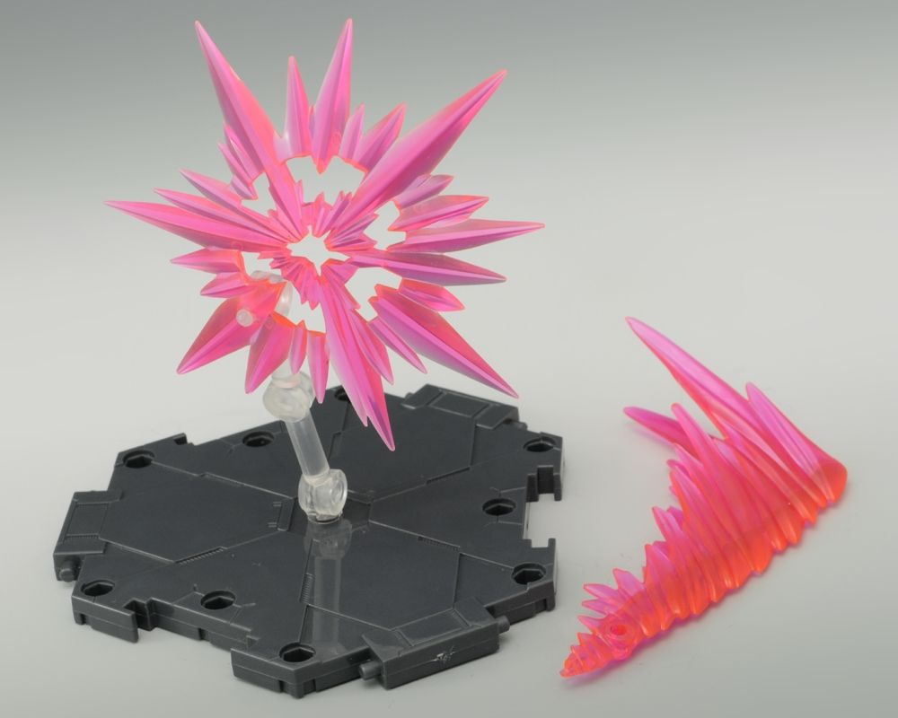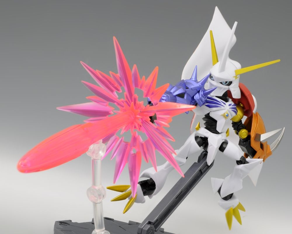 クリアピンクのエフェクトパーツ2種&支柱の使用で、砲撃・斬撃の臨場感がアップ!もちろんシリーズ共通の台座も付属していますので、出してすぐにお好きなポーズで飾れます!やはりオメガモンには、マントを大きく翻してのアクションが似合いますね。