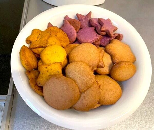 茶色はココアパウダー、黄色はカボチャパウダー、紫色は紫芋パウダーが混ぜてあります。