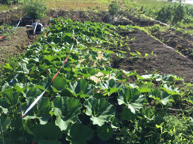 第1農園の粘土質の方が、水や肥料の持ちが良いんでしょうね。前作のじゃがいもでも肥料は与えず、かぼちゃの元肥も追肥も与えていませんが保肥性があるのか効きすぎでもなく程よく栄養を吸収しています。