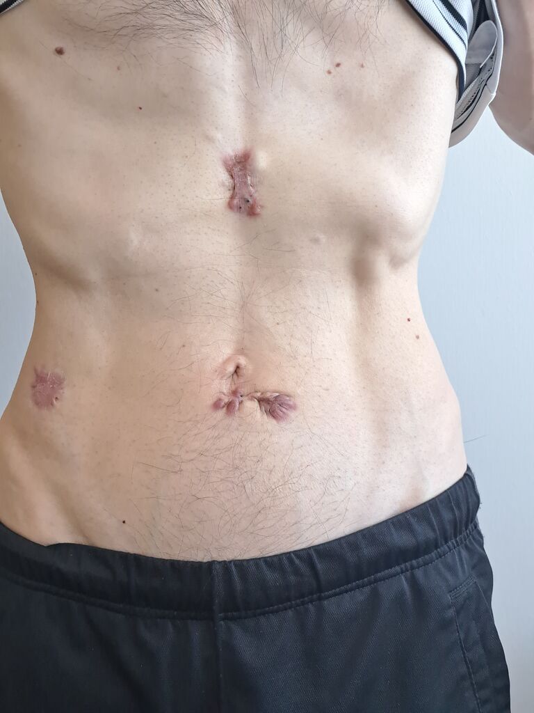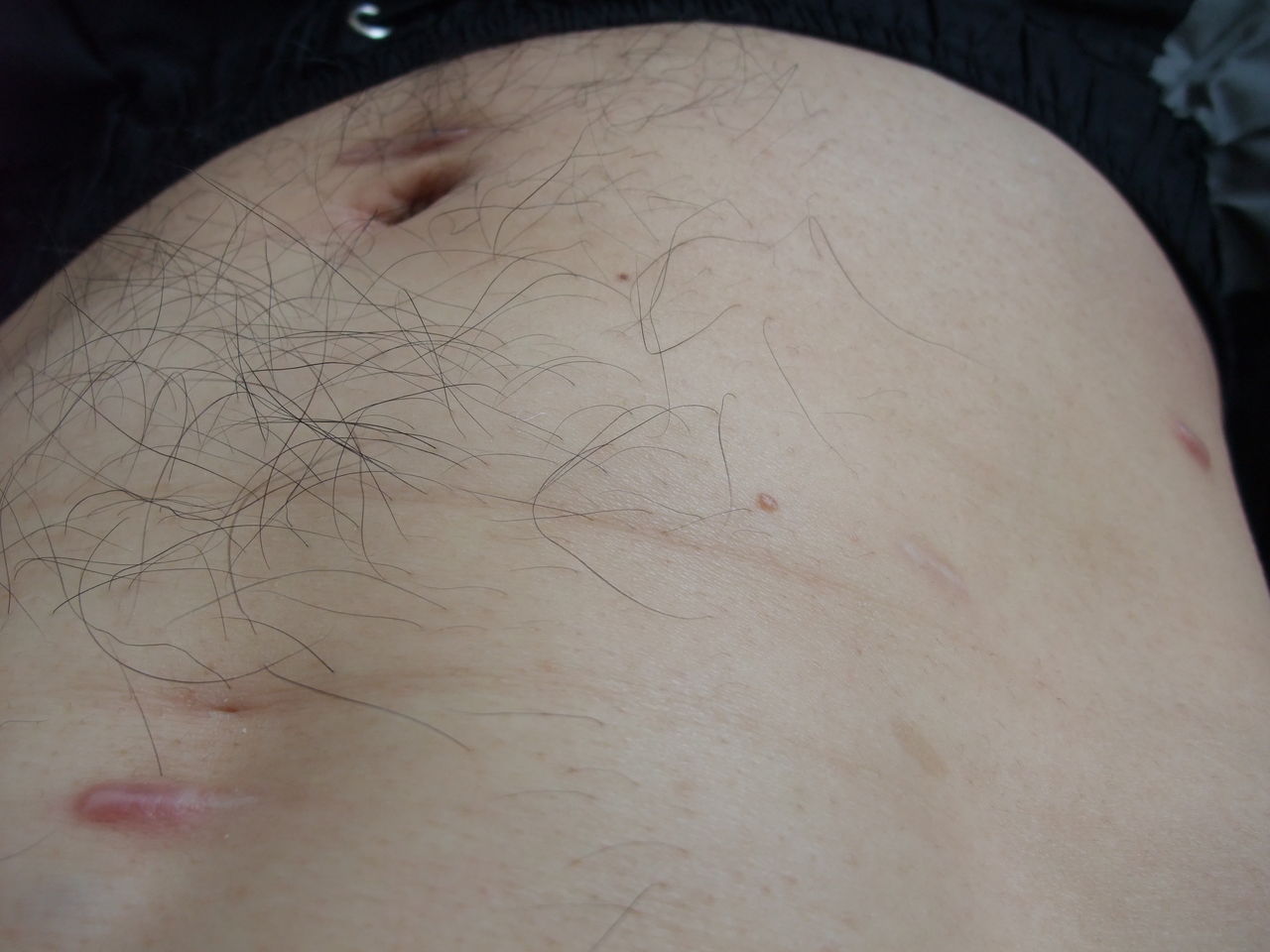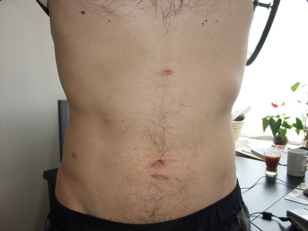 半年後もしくは一年後に再撮影し、傷口(※正面ヘソ上下と左の三箇所)の「綺麗になり具合」を比較検証してみたいと思います。(笑)