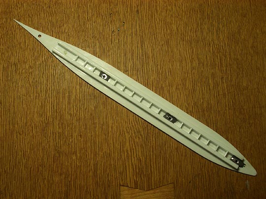 プラバンを梯子状に組んで、船体の反りを押さえようという目論見です。
