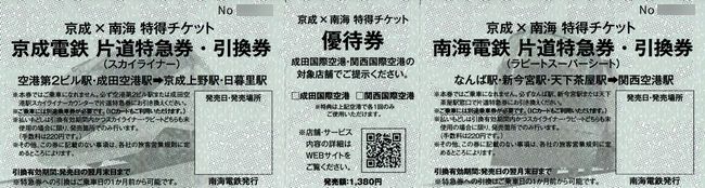 京成と南海の両社で発売しており、発行会社は券片の下部に明記されています。おおむね同一の様式となっていますが、乗車区間や特急券との引き換えを取り扱う駅の表記は当然異なっています。