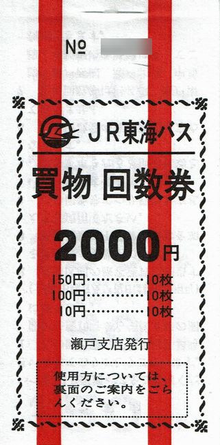 続いて、一般路線バス廃止直前の瀬戸支店で購入した買物回数券です。平日の10時から16時までの間及び土休日に使用することができるものです。150円券10枚、100円券10枚及び10円券10枚の計2,600円分の券片で構成されており、発売額は2,000円です。