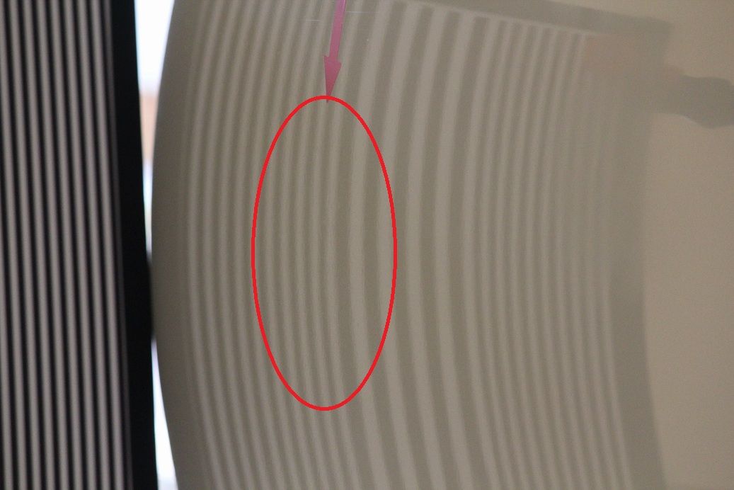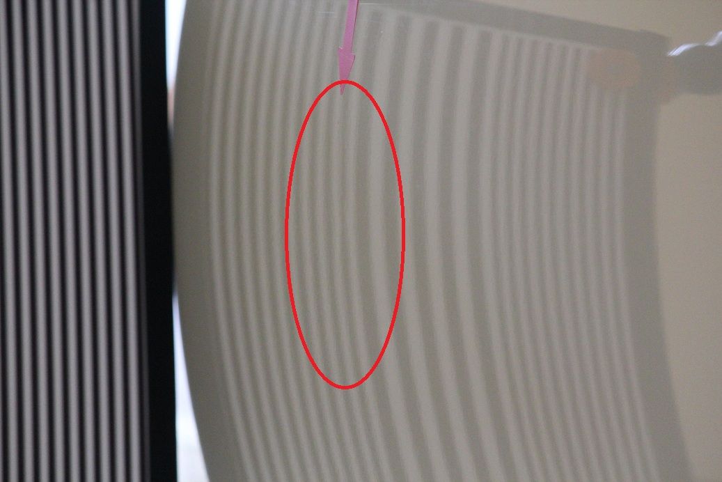 赤丸の中心付近に縦に筋が見えます。施工した痕跡がはっきり。出し過ぎです。押すべきところを押せないと、このようになります。