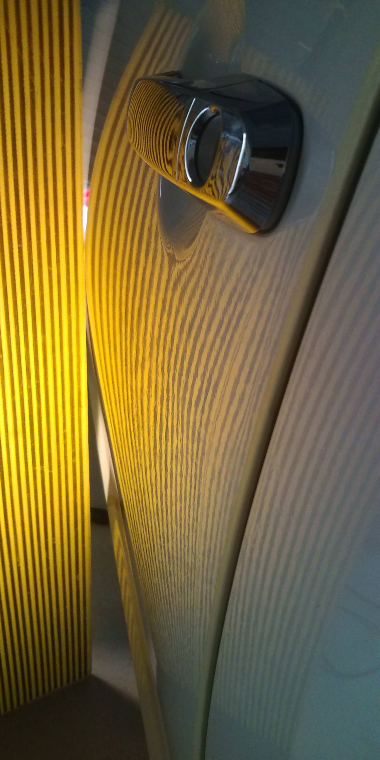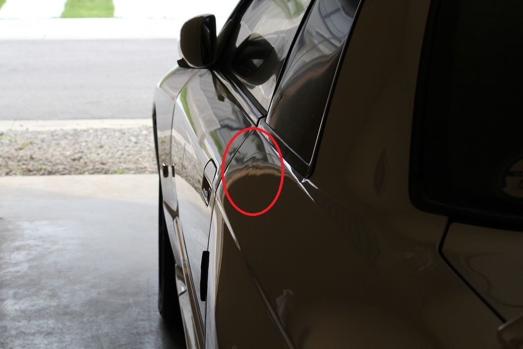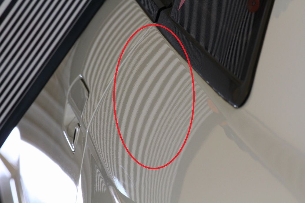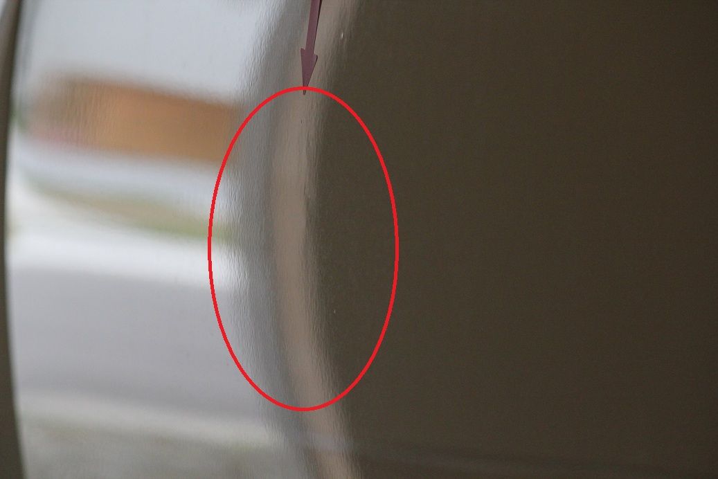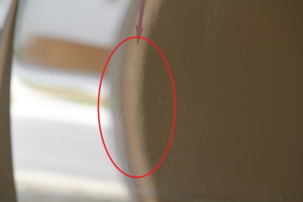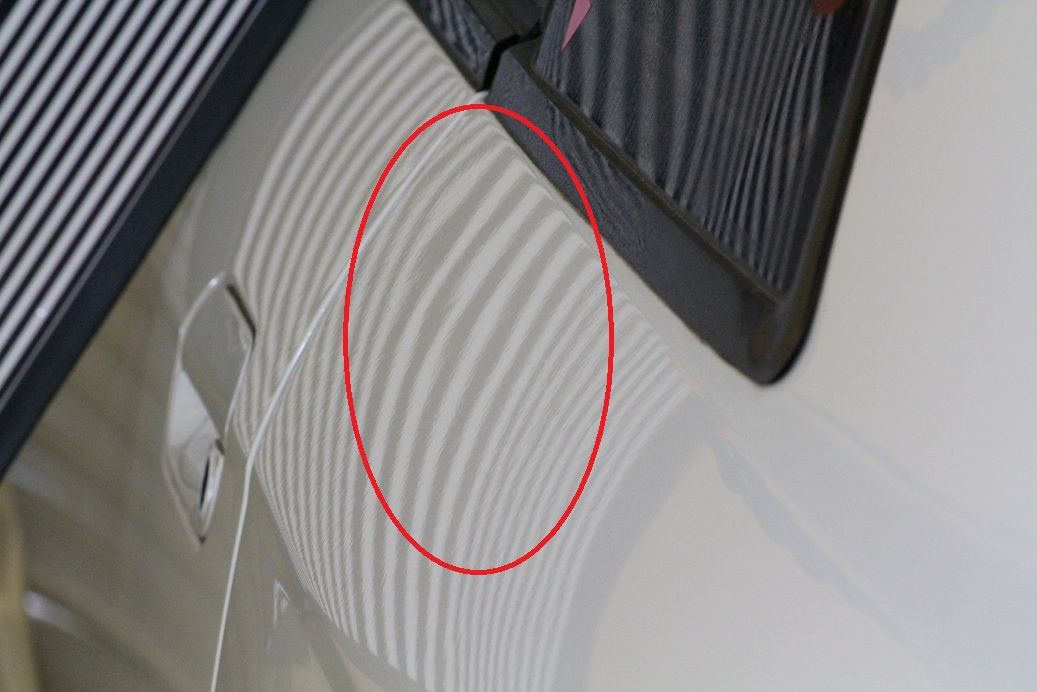 縦に10cmほど、ヘコミを触った跡がはっきりと残っています。手直しできるレベルですが、外に押し出され過ぎてしまっています。また塗装も削られているので、手直し後においても若干のゆがみ、修正跡が残ると予想されます。