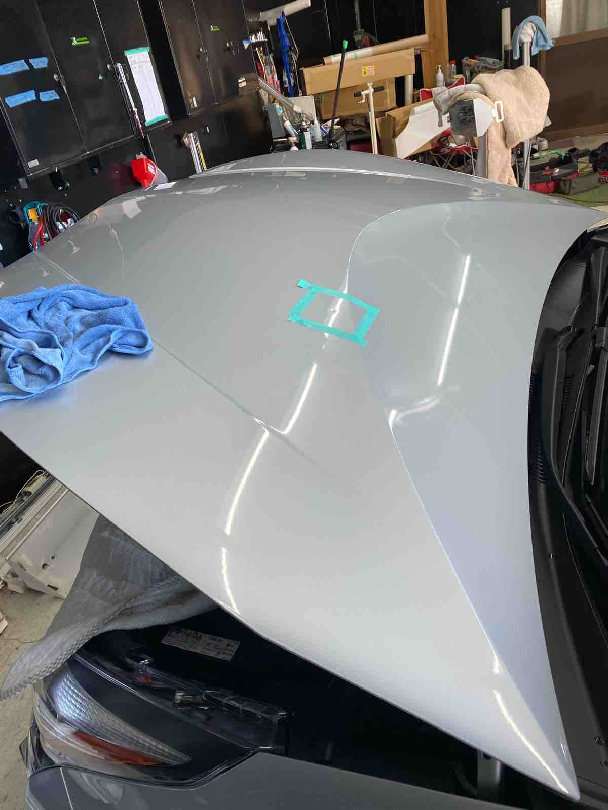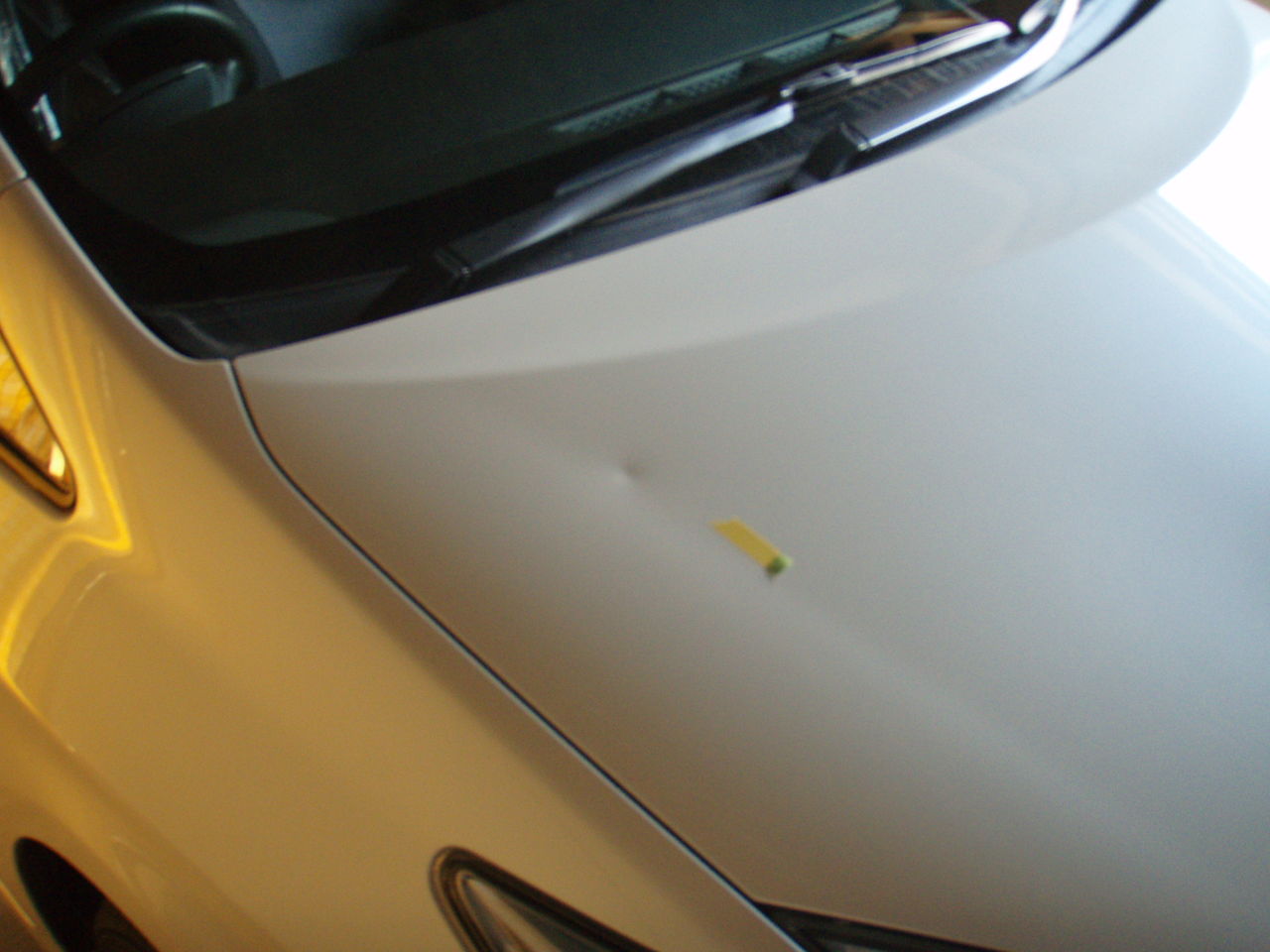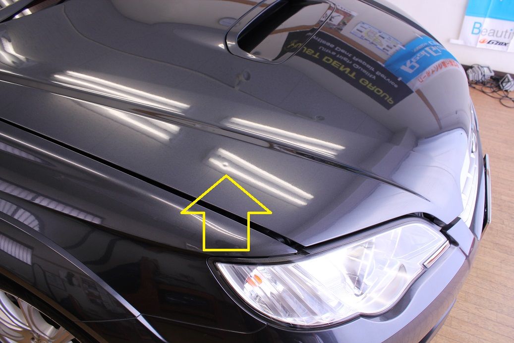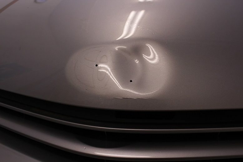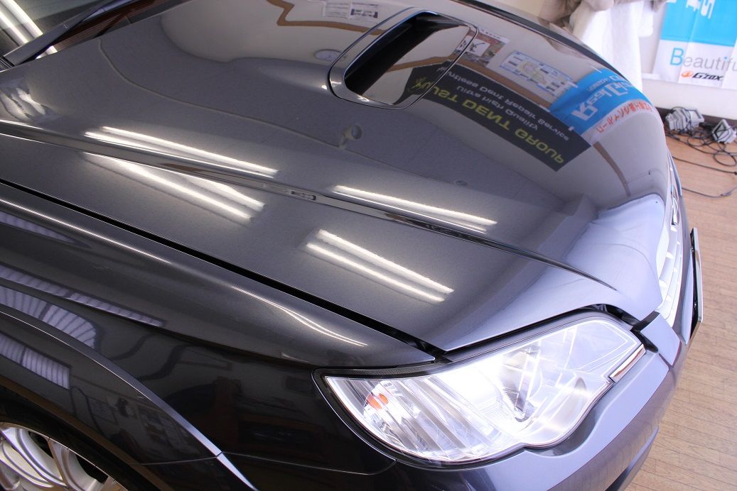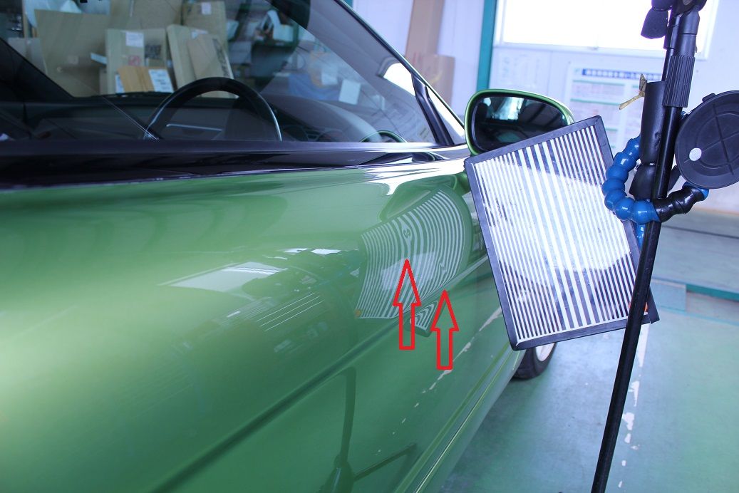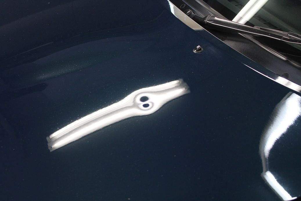 アルミボンネットで、さらにキツめの凹みでキレイに直すには難易度はかなり高めです。