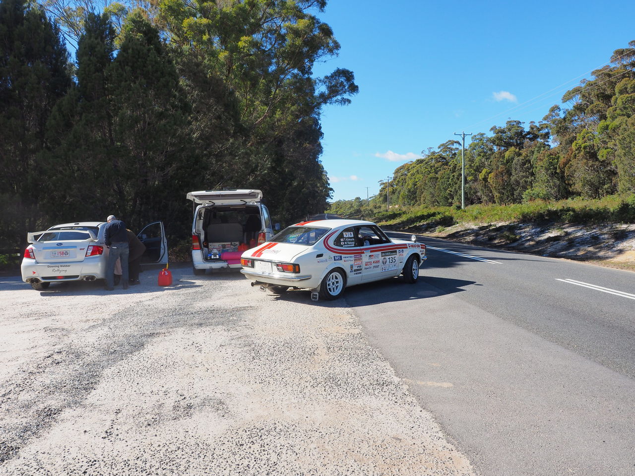 給油ポイントの選定は非常に難しく苦労しました。高速で走る競技車から見つけやすく、かつ連続で来ることを想定して3台分の駐車スペースを確保できる場所を、行ったり来たりしてなんとか見つけました。早めに宿を出発しておいて正解でした。