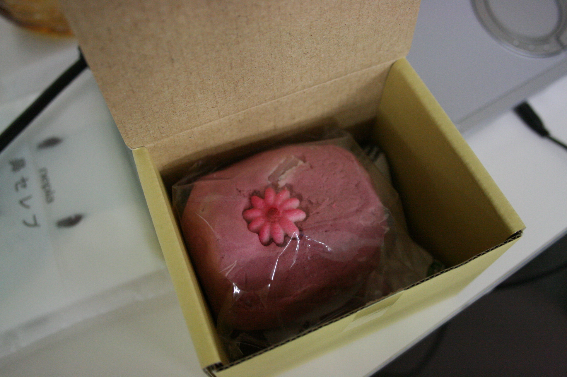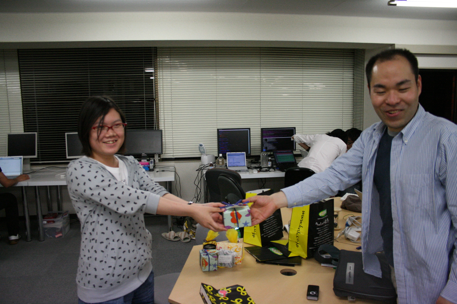 写真はお菓子みたいな石鹸と、バイトさんに、石鹸を渡す手嶋。