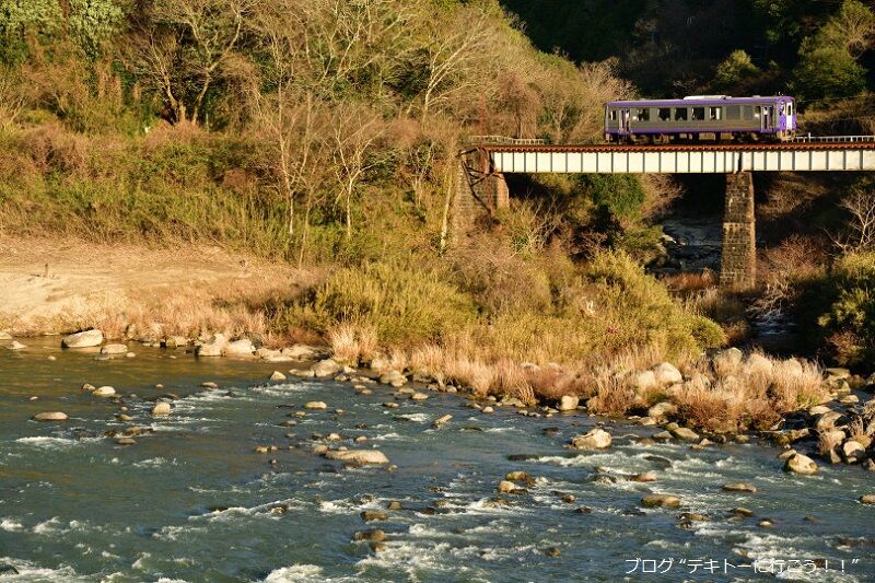 布目川の橋梁を渡るキハ120。手前の川は木津川。