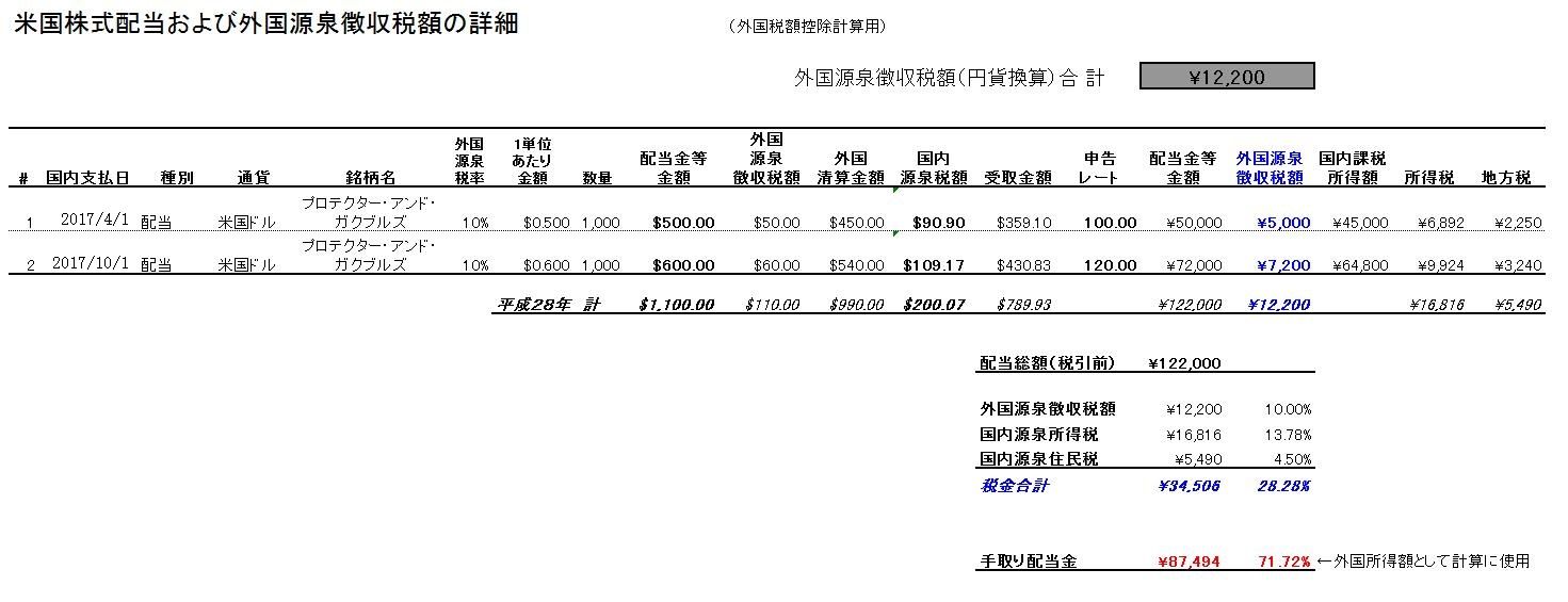 配当に関する収入金額には、米国で10%源泉徴収された後、国内で課税前の配当総額を記入し、源泉徴収税額の欄には既に配当から源泉徴収されている国税と地方税の総額を記入します。(Excel表から簡単に転記できるはずです)