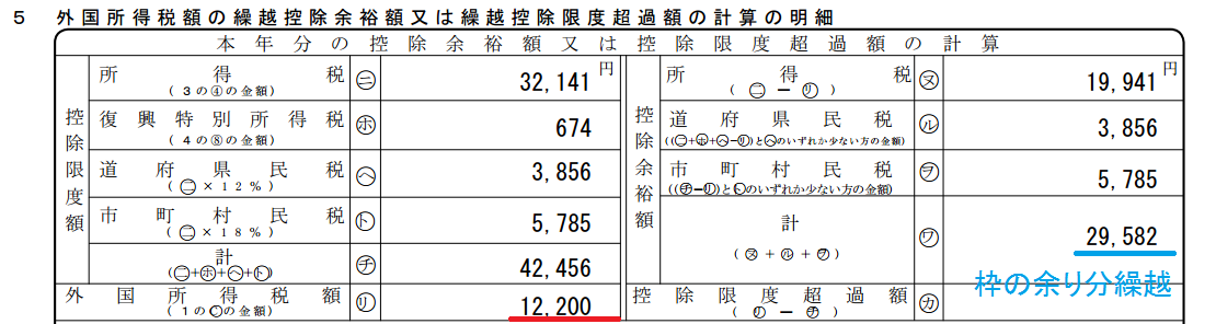 ただし、2回目以降の場合、ここに数字を入れることが重要になってきます。「外国税額控除の繰越控除余裕額」「繰越控除限度額」とかいう用語がそもそもわかりにくいのですが、ここは翌年以降大事になってくる数字だということを覚えておいて損はありません。(最後のほうでこの繰越については触れます)