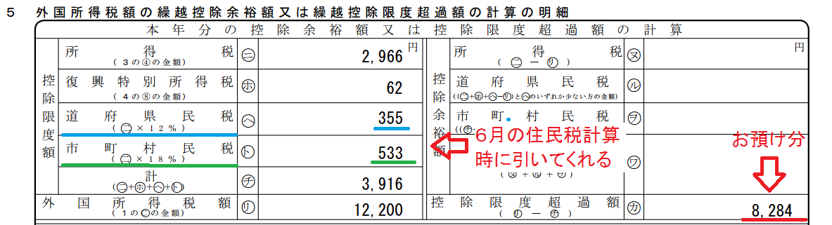 の部分では、先ほど記入したとおり、1年間合計の外国での課税標準額と外国で源泉徴収された額がそのまま記載されています。ここは特段問題ありません。