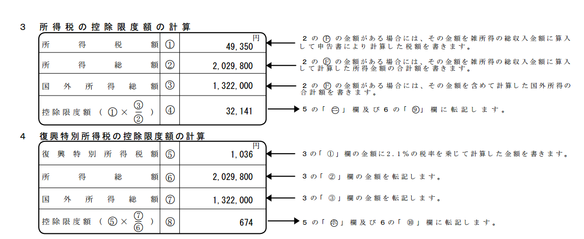 ここで、先回りして最終成果物の「確定申告書(PDF版)」の外国税額控除の部分を先に見てみましょう。