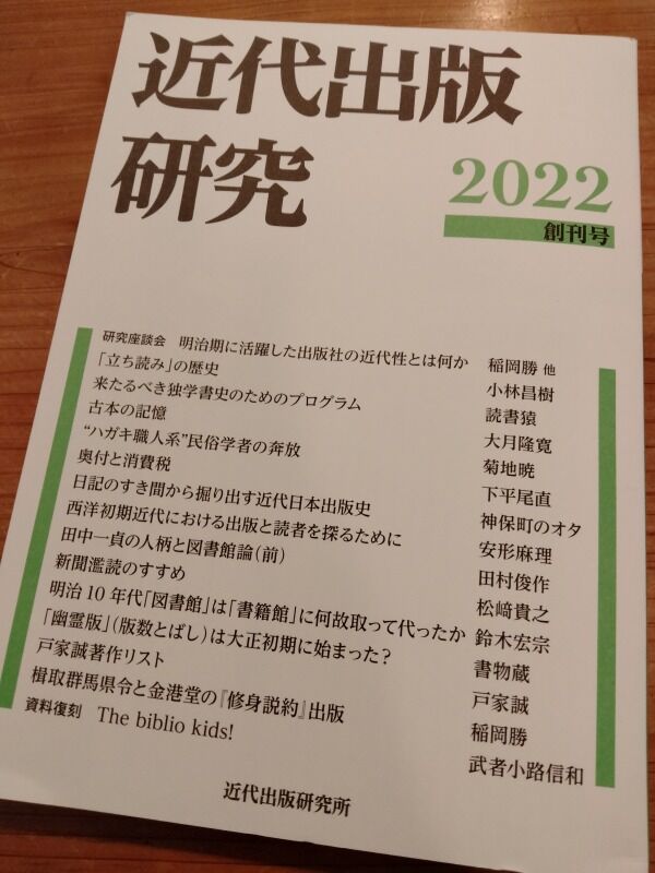 ¤Ä¤¤ÀèÆü¡¢¶áÂå½ÐÈǸ¦µæ½ê¤Ë¤è¤ë¡Ø¶áÂå½ÐÈǸ¦µæ¡ÙÁÏ´©¹æ¤¬´©¹Ô¤µ¤ì¤Þ¤·¤¿¡£¤É¤¦¤¤¤¦¸¦µæ½ê¤«¡¢ÁÏ´©¹æ¤ò¤¸¤Ã¤¯¤êÆÉ¤ó¤Ç¤«¤é¤Î¤ªÏ䷤ˤʤë¤Î¤Ç¤¹¤¬¡¢Ã¼Åª¤Ë¸À¤¦¤È¡¢¶áÂå¡ÊÆüËܤǤÏ1868ǯ¤«¤é1945ǯ¤¢¤¿¤ê¤Þ¤Ç¡Ë¤Ë´©¹Ô¤µ¤ì¤¿½ñʪ´ØÏ¢¤ò¤¤¤í¤¤¤í¤Ê³ÑÅÙ¤«¤é¸¦µæ¤·¤Æ¤¤¤ë¿Í¤¿¤Á¤Î½¸¤Þ¤ê¤Ç¤¹¡£ÁÏ´©¹æ¤Ë¡Ö´ÑÍ÷¼ÖÄÌ¿®¡×Ê®¿åÈÉ¥¥ã¥Ã¥×¤Î¾¾ºêµ®Ç·¤µ¤ó¤¬¡Ö¿·Ê¹ÍôÆÉ¤Î¤¹¤¹¤á¡×¤È¤¤¤¦°ìʸ¤ò´ó¹Æ¤µ¤ì¤Æ¤¤¤ë¤Î¤Ç¹ØÆþ¤·¤Þ¤·¤¿¡£