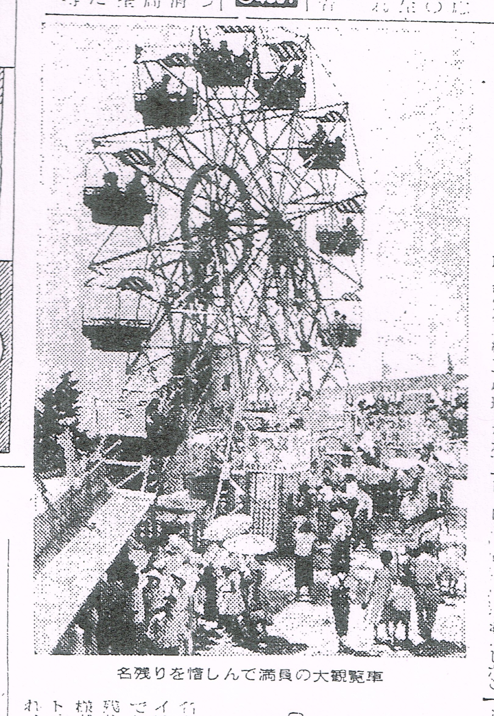 観覧車が設置されたのは、昭和31年の開催時が初と思われます。この年、同時期に比叡山ロープウェイも開通したので、この2大スターの登場で、イベントは大いに盛り上がりました。観覧車は「空中観覧車」と呼ばれ、「大観覧車」ともてはやされます。高さ12メートルですから、現在では豆観覧車なのですが、当時は大観覧車だったのです。「大輪の花のように空に咲いた空中観覧車」と評されています。