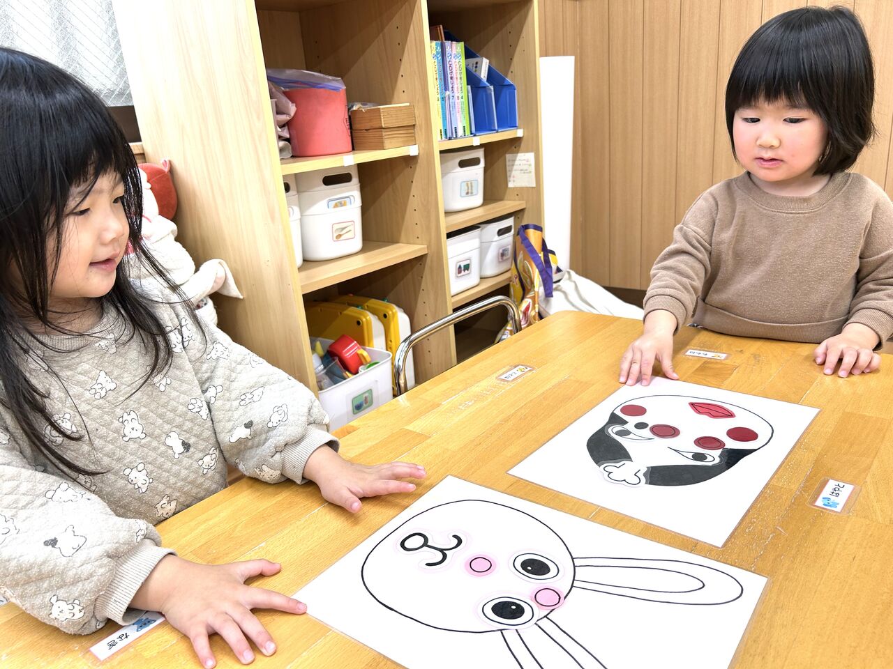 うさぎ組は初めてハサミに挑戦しました。細長い紙をハサミでチョキン。切った紙に糊をつけて髪の毛に見立てました。お家でもやったことがあるのかハサミも糊も上手に使えていてびっくりでした。