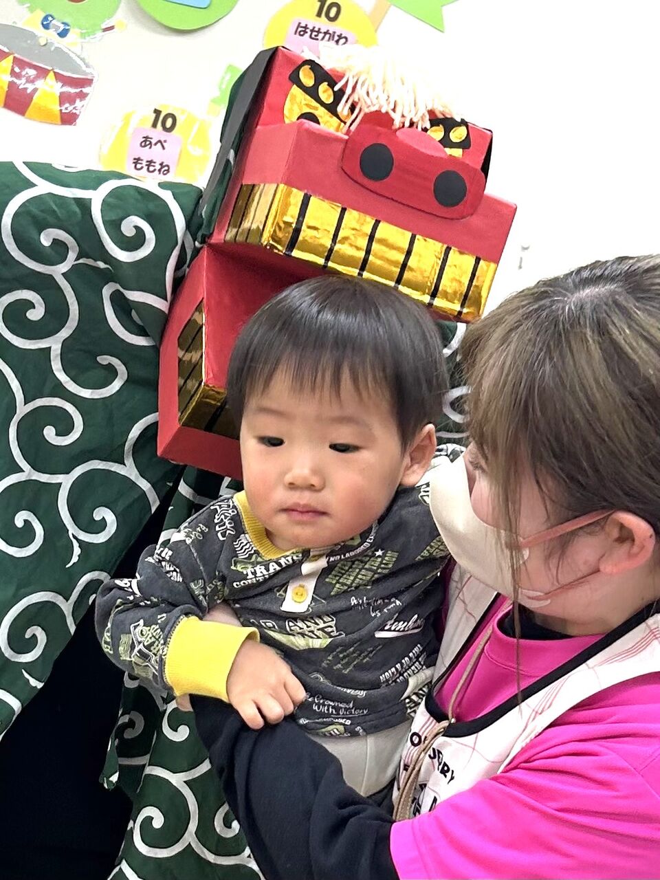 新年初日。そんな子どもたちの所にお囃子の音楽と共にやってきたのは…迫力満点の獅子舞さん!初めて獅子舞さんを見たであろうひよこ組さん。びっくりしすぎて思わず泣いちゃうお友だちも…
