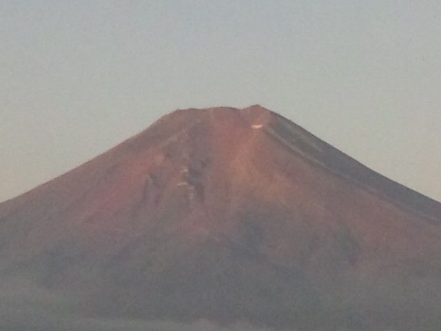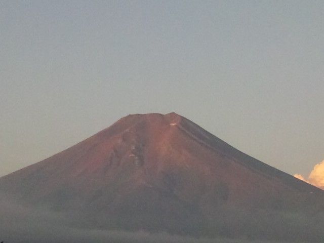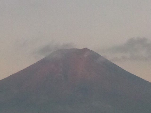 富士山には東からの朝日が当たってきました。朝日が当たってきた部分は、少し赤紫色に変わってきました。