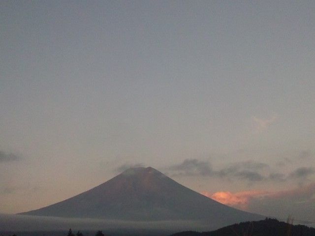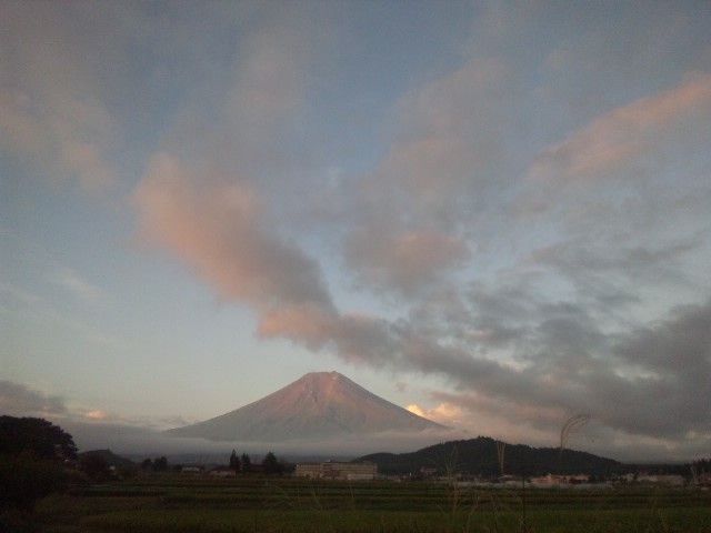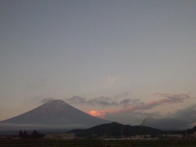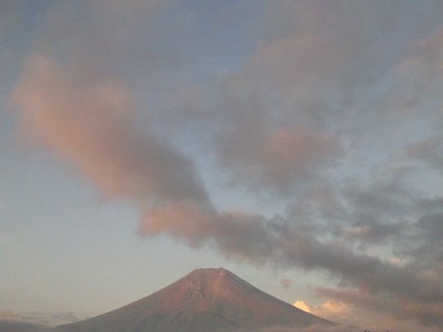 富士山の背景の空にあった雲には、薄いピンク色の朝焼けが出てきました。
