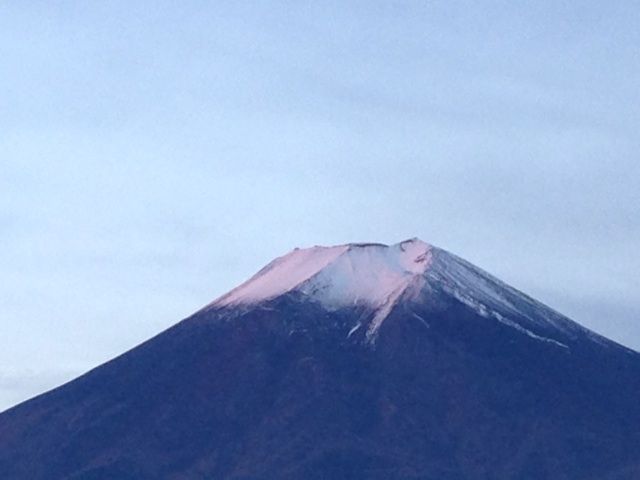 富士山の背景の空には薄いピンク色の朝焼けが出てきました。