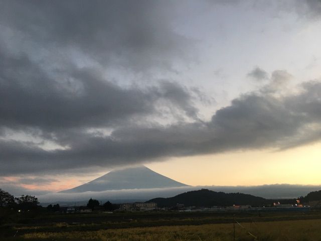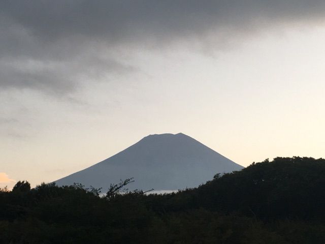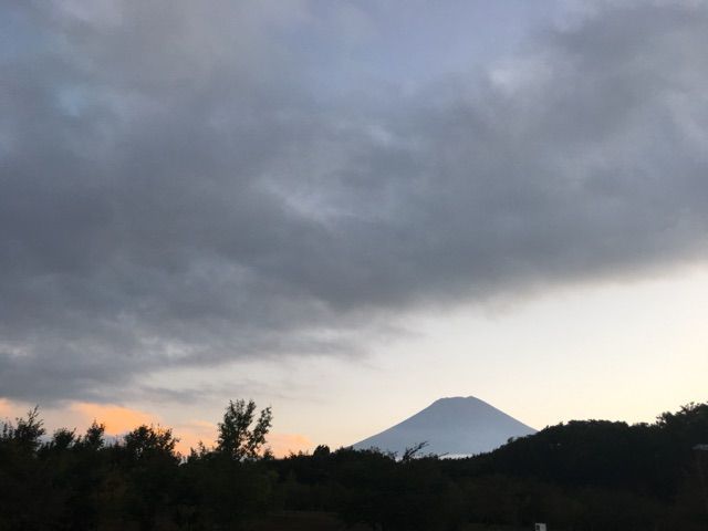 夕日は西の山に沈んでしまっていて、富士山の背景の空には薄いオレンジ色の夕焼けが見えていました。