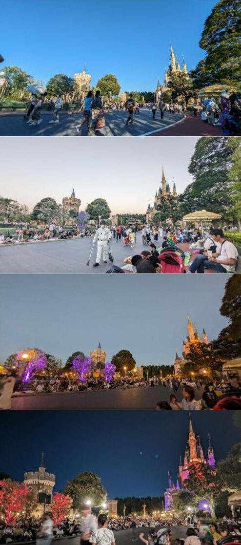 わけもわからず座れる場所を探し回り、シンデレラ城前の広場で一息。