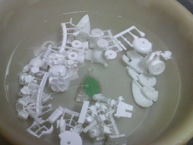 先ずはお湯に着けてパーツの歪みを取ります、まぁ今回は成型が綺麗で、ほとんど歪んで無かったですが
