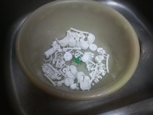 歪みが取れたら、洗剤に漬けて、離型剤を洗浄今回はファインモールドのご機嫌クリーナーに20分位漬けた後に、古歯ブラシで擦り落としました