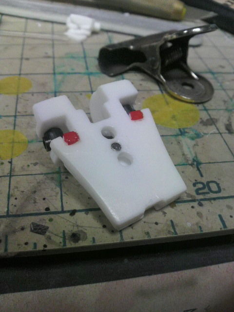 胴体の基部を製作ポリキャップの受けを接着すると赤く塗った部分が裏側に突き出します、ここは面一に整形しときましょう
