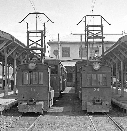 いつ取り替えられたか、残された写真を見ると、デキ22は割と早いうちに替えられていていますが、デキ23・24はかなり後までこのままでした。特にデキ24は、部分廃止の前年、1958(昭和33)になっても、このパンタを乗せています。
