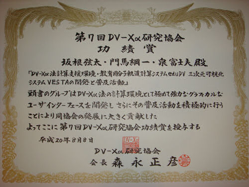 2008年08月08日、兵庫県立大学姫路書写キャンパス書写紀念会館で開催された第5回DV-Xα国際ワ−クショップ&第21回DV-Xα研究会にて、「DV-Xα法計算支援環境・教育用分子軌道計算システムeduDV・三次元可視化システムVESTAの開発と普及活動」が評価され、坂根弦太・門馬綱一・泉富士夫の3名に対して第7回DV-Xα研究協会功績賞が授与されました。