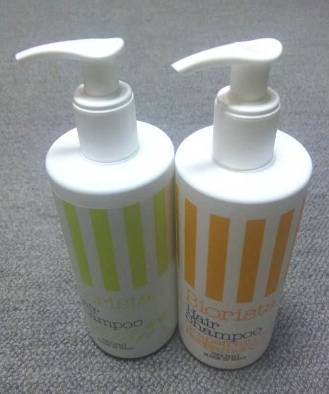 我が家のシャンプー「Biorista」。イタリアの豊かな大地で育ったオーガニックのフルーツや野菜のエキスをふんだんに使ったものらしい。新鮮なフルーツをシャンプーで丸かじり。自然の恵みで洗髪するとは、なかなか気持ちいい。ボトルのデザインもお洒落だなあなんて。