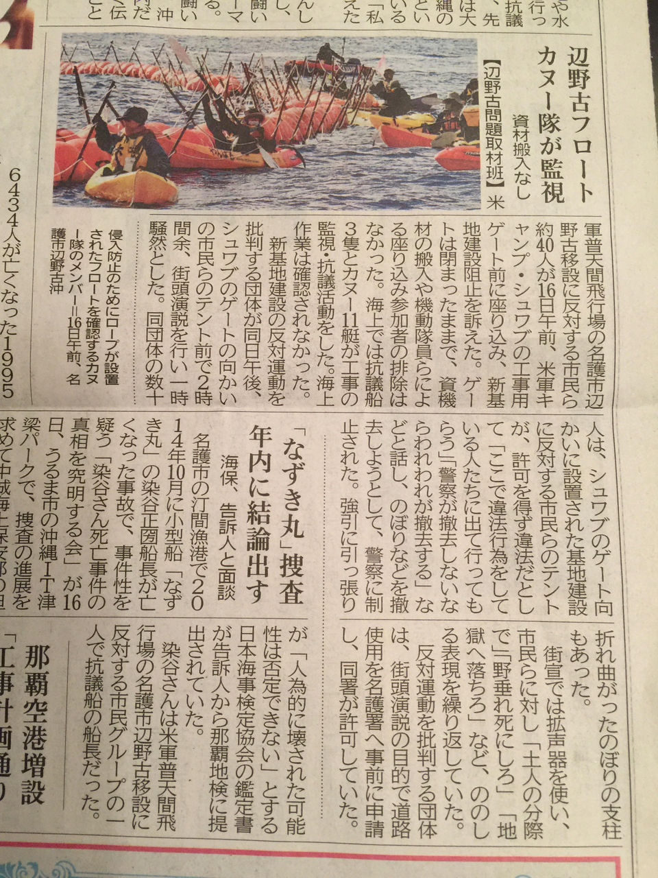 最初、この記事を探し出せないで完全にスルーされてしまったのかと思った。見出しになかったからだ。この「辺野古フロートカヌー隊が監視」の最後の部分に書いてあった。