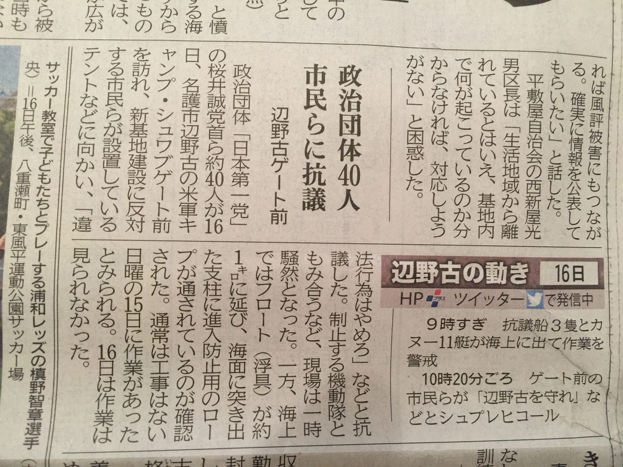 昨日の日本第一党(党首桜井誠)による沖縄辺野古違法テント抗議活動を、沖縄の二つの新聞(沖縄タイムスと琉球新報)は完全無視することが出来なかったようで紙面で伝えた。