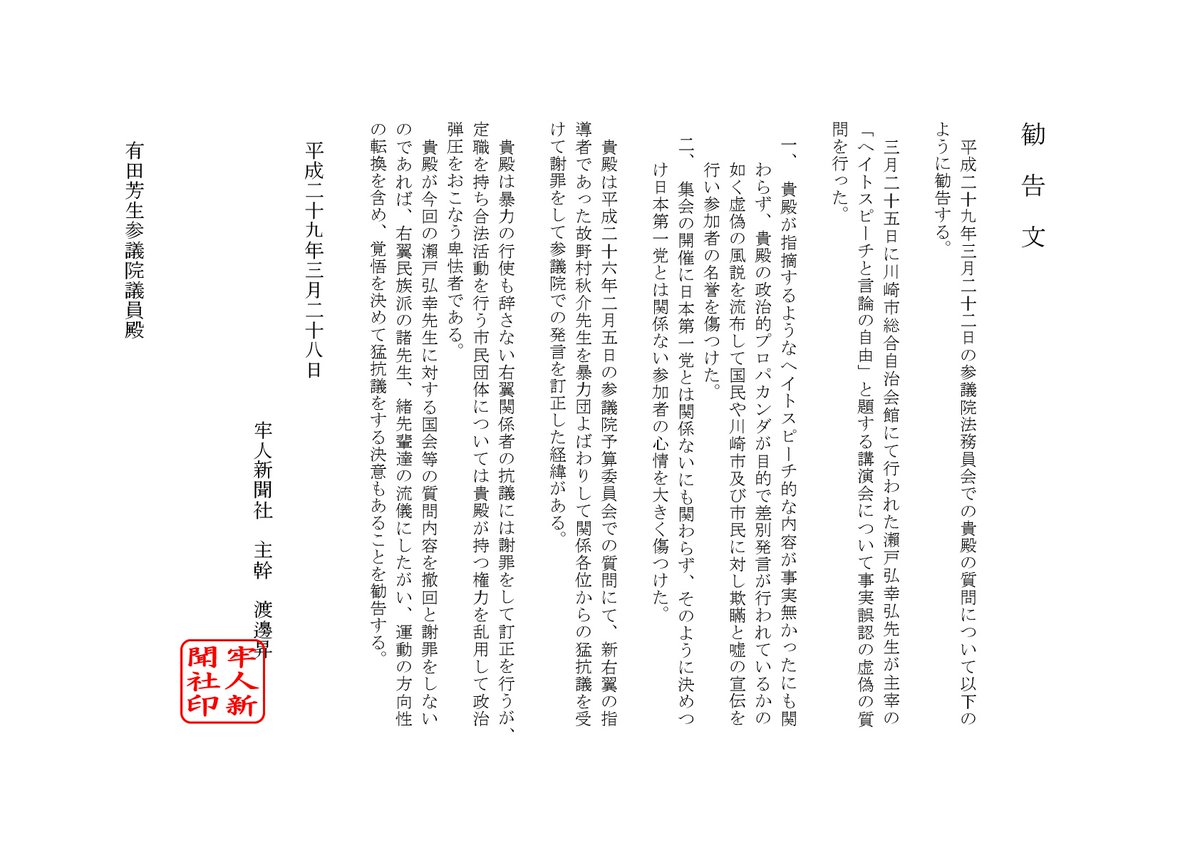 ¡ µ®Å¤¬»ØÅ¦¤¹¤ë¤è¤¦¤Ê¥Ø¥¤¥È¥¹¥Ô¡¼¥ÁŪ¤ÊÆâÍÆ¤¬»ö¼Â̵¤«¤Ã¤¿¤Ë¤â´Ø¤ï¤é¤º¡¢µ®Å¤ÎÀ¯¼£Åª¥×¥í¥Ñ¥«¥ó¥À¤¬ÌÜŪ¤Çº¹ÊÌȯ¸À¤¬¹Ô¤ï¤ì¤Æ¤¤¤ë¤«¤ÎÇ¡¤¯µõµ¶¤ÎÉ÷Àâ¤òήÉÛ¤·¤Æ¹ṉ̃¤äÀîºê»ÔµÚ¤Ó»Ô̱¤ËÂФ·µ½â֤ȱ³¤ÎÀëÅÁ¤ò¹Ô¤¤»²²Ã¼Ô¤Î̾ÍÀ¤ò½ý¤Ä¤±¤¿¡£