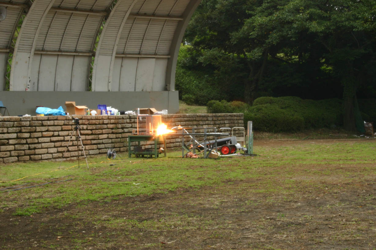 写真はこのときに行われたロケットエンジン(ハイパーテック)の燃焼試験。