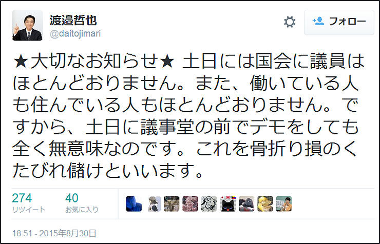 「★大切なお知らせ★ 土日には国会に議員はほとんどおりません。また、働いている人も住んでいる人もほとんどおりません。 ですから、土日に議事堂の前でデモをしても全く無意味なのです。これを骨折り損のくたびれ儲けといいます」