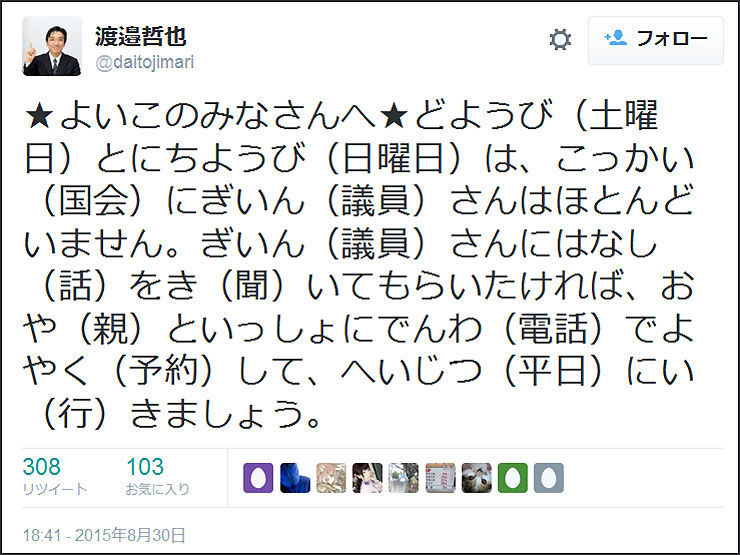 「★よいこのみなさんへ★どようび(土曜日)とにちようび(日曜日)は、こっかい(国会)にぎいん(議員)さんはほとんどいません。 ぎいん(議員)さんにはなし(話)をき(聞)いてもらいたければ、おや(親)といっしょにでんわ(電話)でよやく(予約)して、へいじつ(平日)にい(行)きましょう」