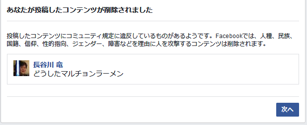 これが差別用語だという認識であるならば、Facebookの運営は一介のラーメン屋であるマルチョンラーメンに不当な差別をしている、ともいえませんか?明らかに差別用語を取り違えた、あなた方の間違いです。