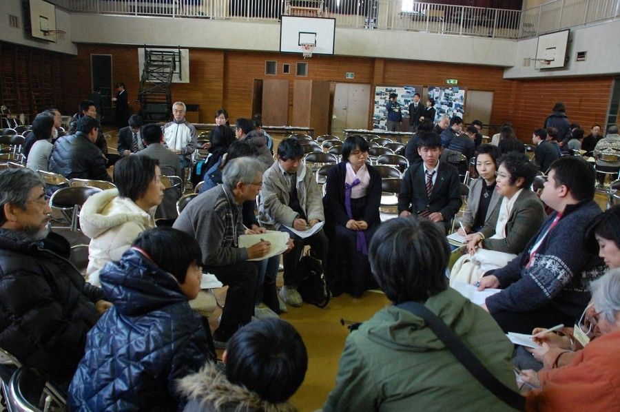 朝鮮学校の教員や生徒を交えグループトークで感想を語り合う参加者=神奈川朝鮮中高級学校