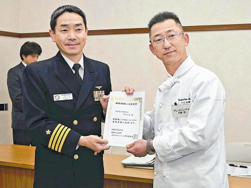 会の終わりに、総監部の大井一史管理部長が各店の代表者やシェフに艦艇レシピの決定書を授与。護衛艦「いせ」のカレーを再現するクレイトンベイホテル(呉市築地町)内のレストラン「ソーニョ」の加藤修道シェフ(50)は「頑張って『いせ』の味に忠実なカレーを作りたい」と意気込んだ。