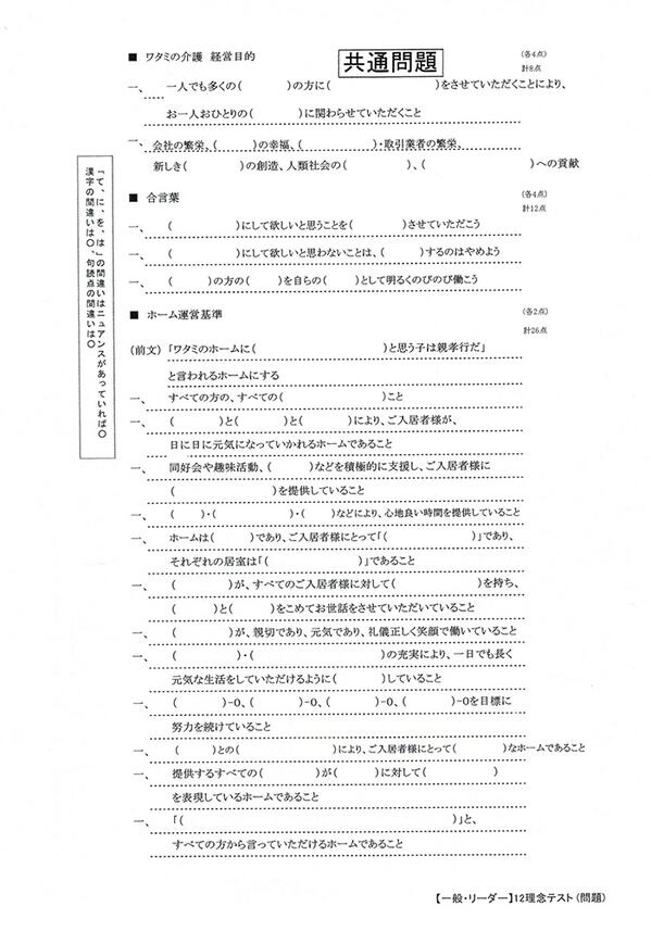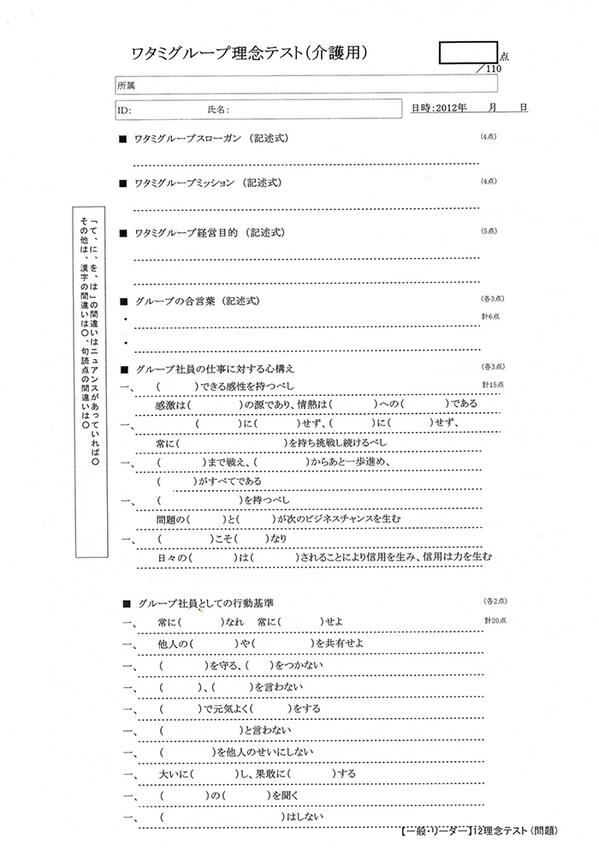その理念テストは「ワタミグループスローガン(4点)」「ワタミグループ経営目的(4点)」「グループの合言葉(各3点)」など記述式の問題から、