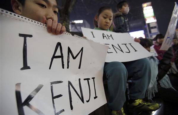 2月8日、都内で「私はケンジ」のプラカードを掲げる人。後藤さんの死を悼む動きが全国に広がったが…(AP)