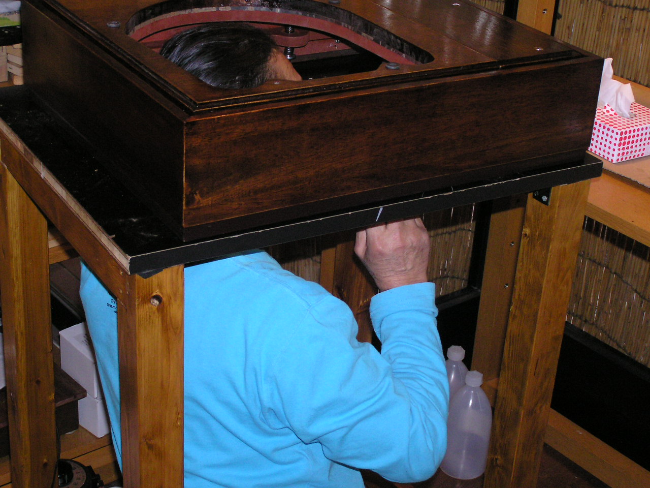 アームボードは交換式で寸法はヨコ57.5cm×奥行49 cm×高さ17 cm、重量は、15kgです。いずれも、アームボードは2枚付属し、グレイタイプはトップボード黒色塗装、側板はマホガニー色(オイルステン仕上げ) アイボリータイプ(グリース軸受け)はトップボード、側板とも外側はマホガニー色(オイルステン仕上げ)となっています