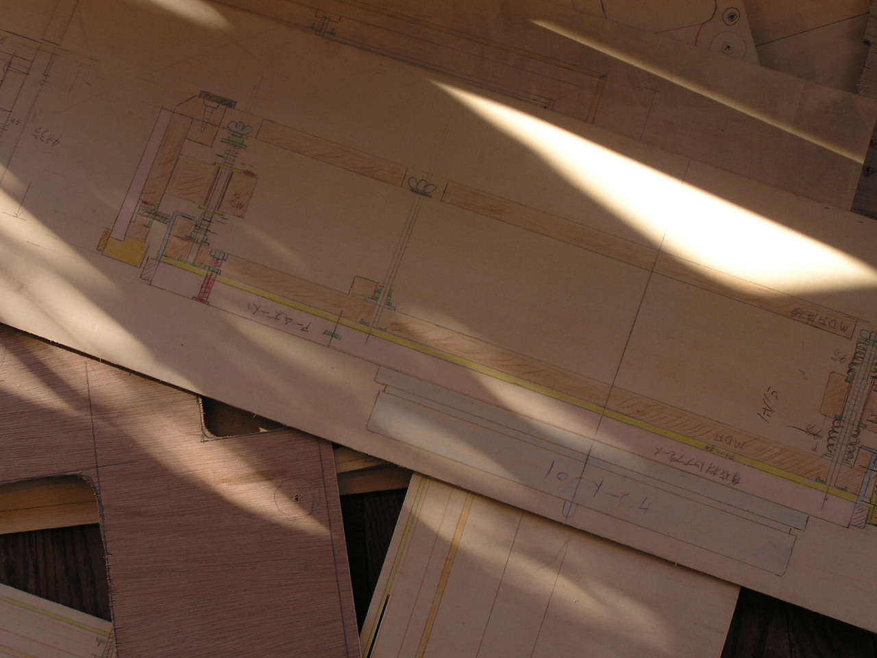 コイルバネは、直接キャビネット本体に触れておらず座金に乗るようなっています。 外側は二重になって、内部はMDF15mm、外側が14mmの単板仕様のものを使用、外板は内側のMDFからダンピングコントロールされた木ネジで固定されます。 キャビネット底板は敷板に完全に組み込みまれる構造にしておき、底板に設けられた木製のピンによって敷板と接合するようになっています。 接合部は底板側に5mmのフェルトリングを取り付け、敷板にある円型の設置用の台座に乗るようになっています。 これにより、キャビネット本体と敷板のズレが無くなり、安定したものになります。 敷板は、キャビネット本体のダンピングファクターの帰還率を弛めた為、その強化をはかろうと大変複雑なものになりました。 基本的には、TD124専用敷板の思想の流用ですが、形はかなり異なっており、特に中央のダンピングリングは十字型の支えを持っていますが、押え板の中にもコイルバネが仕込んであり、上部金板からの下方への圧力に対して応力を持たせてあります。 奥の金具は、地震の際の落下防止用です。 本キャビネットはこの様に多くのパーツからなっており、その制作時間も調整を含めて50日程かかり、さすがに、ガラード301用キャビネット製作は今回で本当に終了とさせていただきます。 以上T氏