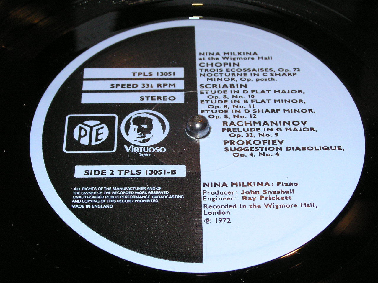 TPLS13050/1 『アット ウィグモア・ホール』 バッハ フランス組曲より8曲/スカルラッティ ソナタ(6曲)/ハイドン ソナタ32番/モーツァルト メヌエットニ長調 ソナタK.576/ショパン 3つのエコセーズ 夜想曲「遺作」/スクリャービン 練習曲(3曲)/ラフマニノフ 前奏曲ト長調/プロコフィエフ 悪魔的暗示 ニーナ・ミルキナ(Pf) 録音1972年 ウィグモアホール ロンドン 水色と黒の半円VIRTUOSO-PYEステレオレーベル(オリジナル) P;J.スナシャル E;R.プリケット すごいピアニストを聴いてしまう。 ロシア生まれのイギリスのピアニスト、録音時は53歳。 どうすればこういう人魚のような音を出せるか。 惹きこまれた。